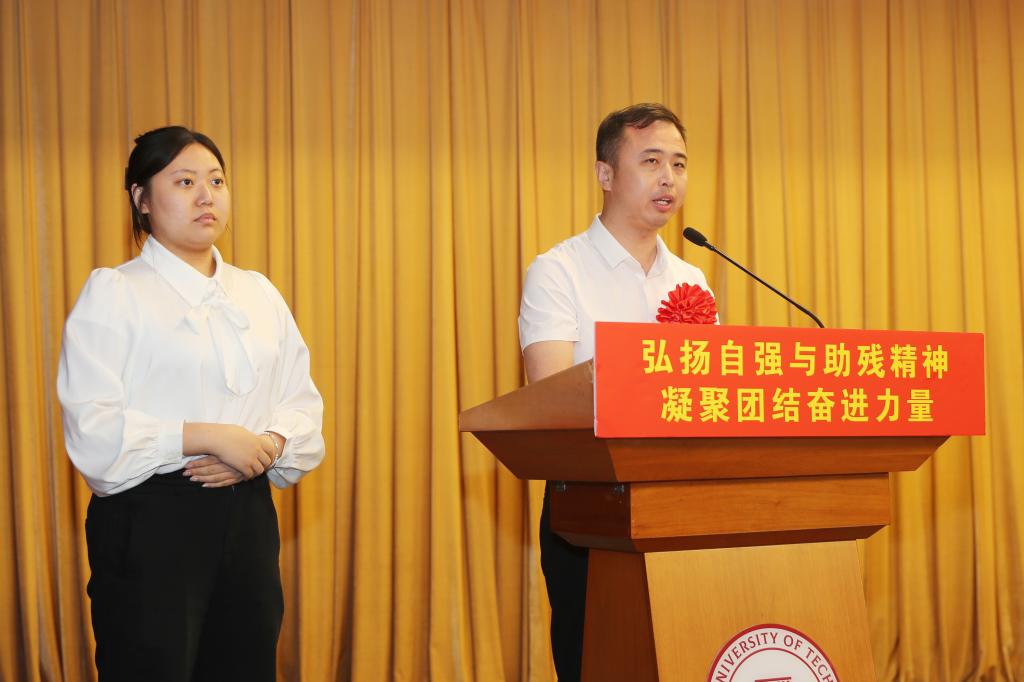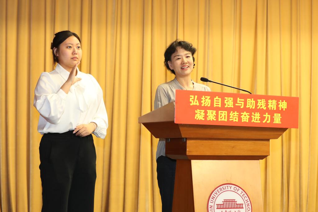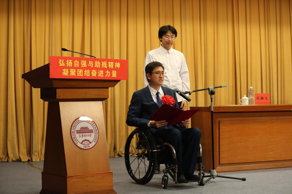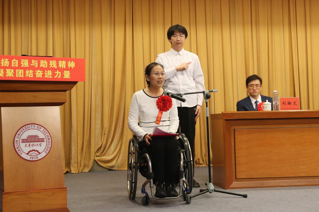 在報告會環節,北京新生命養老助殘服務中心主任唐占鑫,河北承賢健康管理有限公司總經理王磊,我校藝術學院2012屆畢業生、天津吉文傳媒科技有限公司總經理劉瀚文,南開大學環境科學與工程學院資料中心主任卜欣欣,我校聾人工學院教師李子剛等5位全國自強模范、全國殘疾人工作先進集體代表生動地講述了在各自領域自強奮進、扶殘助殘、追求夢想的奮斗故事。他們的感人事跡和精彩分享贏得了現場師生的陣陣掌聲,引發了熱烈反響。