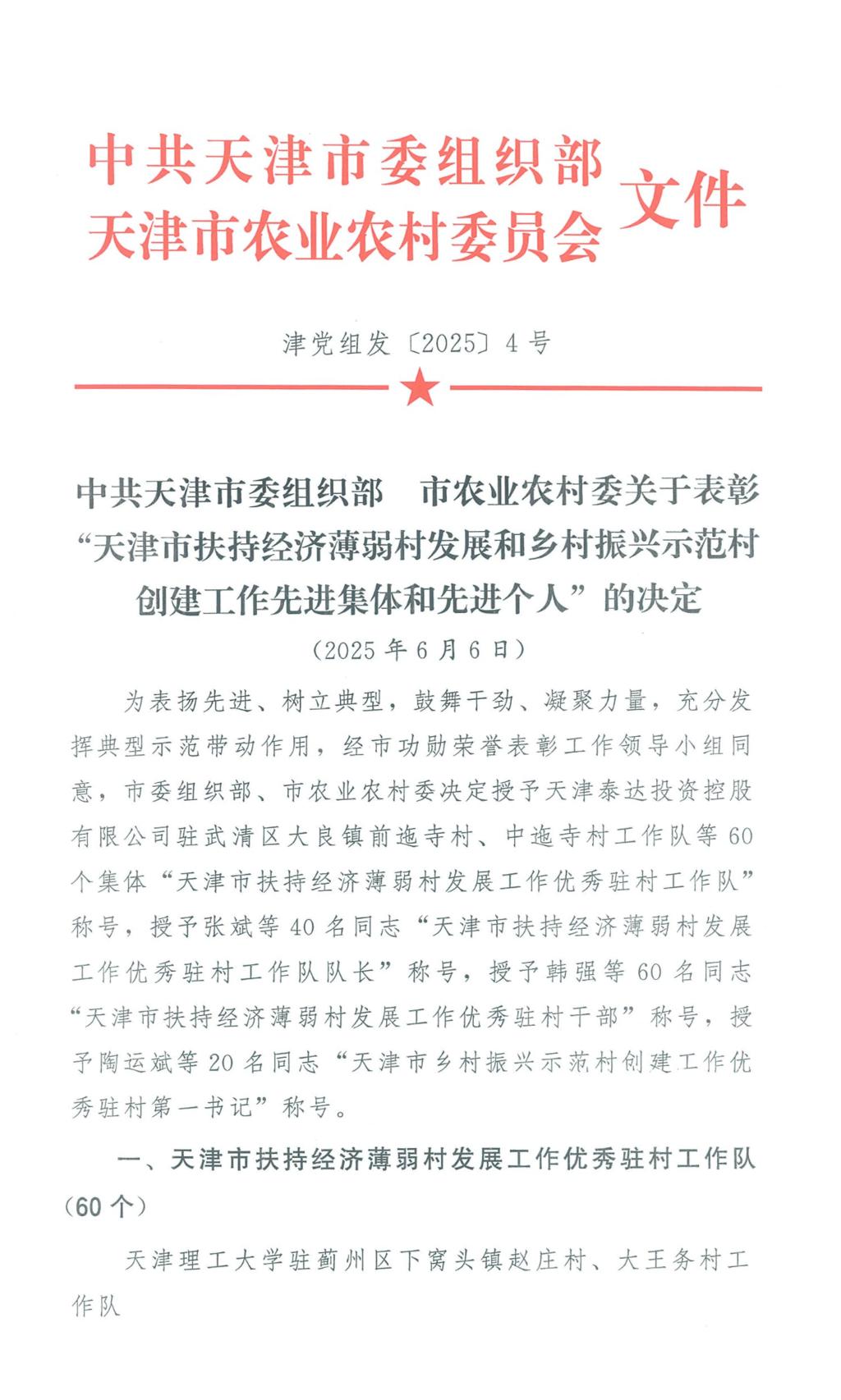 近日,市委組織部、市農業農村委對在扶持經濟薄弱村發展和鄉村振興示范村創建工作中的先進集體和個人進行表彰。我校駐薊州區下窩頭鎮趙莊村、大王務村工作隊榮獲“天津市扶持經濟薄弱村發展工作優秀駐村工作隊”稱號。