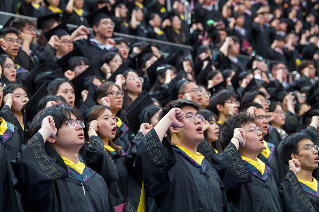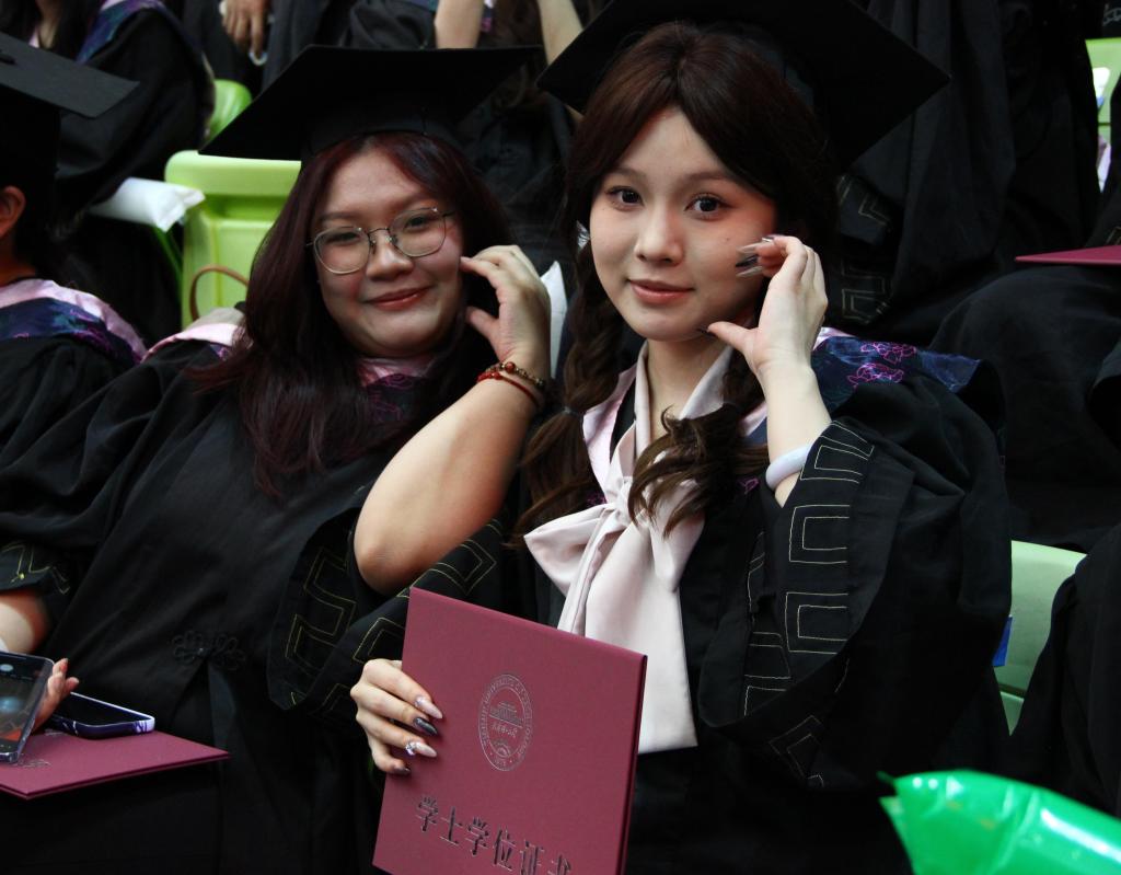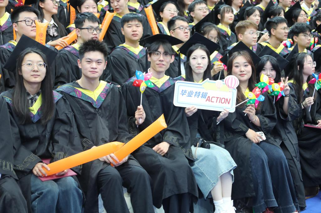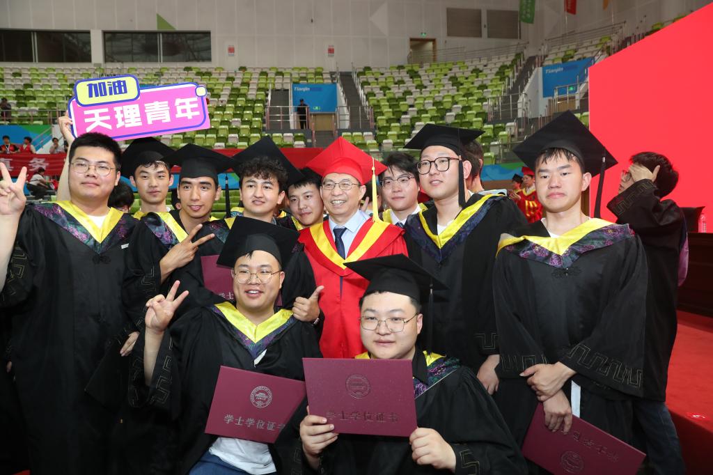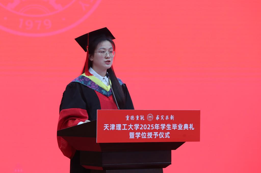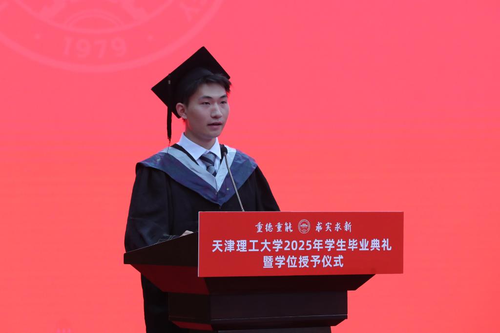 本科畢業生代表、環境科學與安全工程學院王俊懿深情回顧了在天理校園度過的青春歲月,特別感謝母校給予的“天理溫度”、老師們無私的諄諄教誨,以及后勤人員日復一日的默默付出。他表示,作為新時代青年,將始終胸懷祖國山河,勇擔社會責任,放眼世界格局。他號召全體畢業生在各自的人生道路上,既要成就自我,更要服務他人,努力貢獻青春力量。