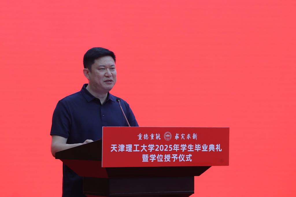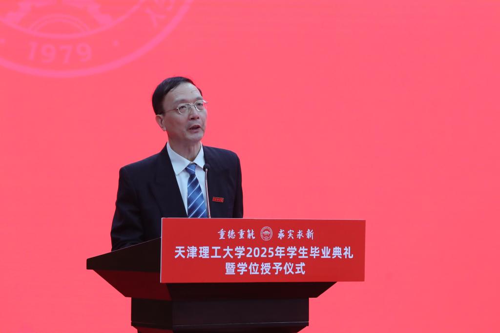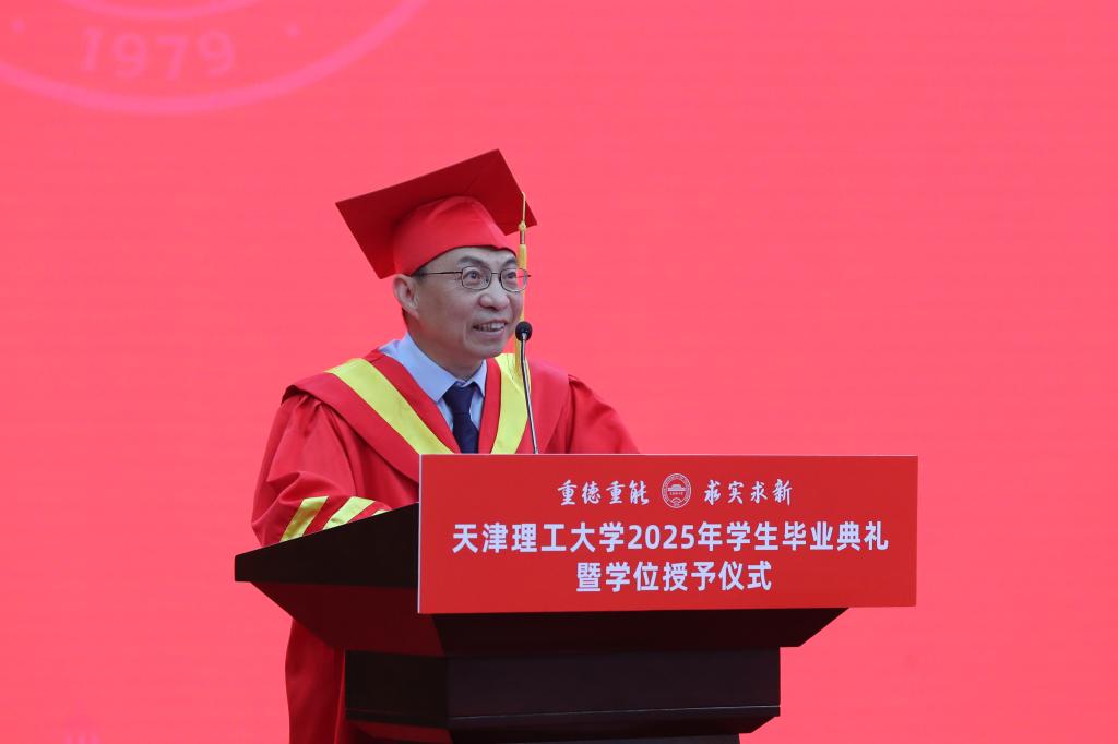 畢業典禮在莊嚴的國歌聲中拉開帷幕。黨委常委、副校長陳勝勇宣讀《天津理工大學學位評定委員會關于授予博士、碩士學位的決定》。黨委常委、副校長葉寧宣讀《天津理工大學學位評定委員會關于授予學士學位的決定》。黨委常委、副校長王鐵宣讀《天津理工大學關于表彰2025屆本科優秀畢業生、優秀退役士兵畢業生的決定》。
