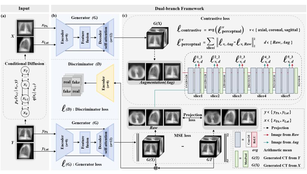 該研究聚焦于從X射線圖像到CT圖像的重建,針對因輸入信息維度受限和輸入樣本不足而導(dǎo)致結(jié)構(gòu)與紋理重建困難的問題,提出了一種基于條件擴(kuò)散模型與對比學(xué)習(xí)的重建方案。該方案利用條件擴(kuò)散模型對X射線圖像進(jìn)行骨骼抑制用于數(shù)據(jù)增強(qiáng),有效緩解了二維輸入信息不足的問題。同時,基于對比學(xué)習(xí)的雙端網(wǎng)絡(luò)聯(lián)合構(gòu)建了對比損失、投影損失以及GAN的對抗性損失并在一個端到端的統(tǒng)一框架中進(jìn)行高效學(xué)習(xí),顯著提升了重建CT的結(jié)構(gòu)和紋理質(zhì)量。大量實(shí)驗(yàn)結(jié)果驗(yàn)證了該方案的優(yōu)越性,所生成CT圖像在PSNR、SSIM等關(guān)鍵指標(biāo)上均達(dá)到SOTA水平,并呈現(xiàn)出較強(qiáng)的臨床應(yīng)用潛力。