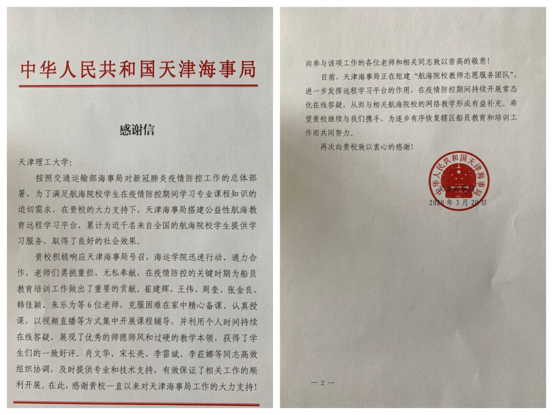 “貴校積極響應天津海事局號召,海運學院迅速行動、通力合作,老師們勇挑重擔、無私奉獻,在疫情防控的關鍵時期為船員教育培訓工作做出了重要的貢獻。”近日,我校收到一封來自天津海事局的感謝信,對我校海運學院老師在疫情防控期間,義務為近千名來自全國的航海院校學生提供課程輔導、在線答疑等學習服務表示感謝。