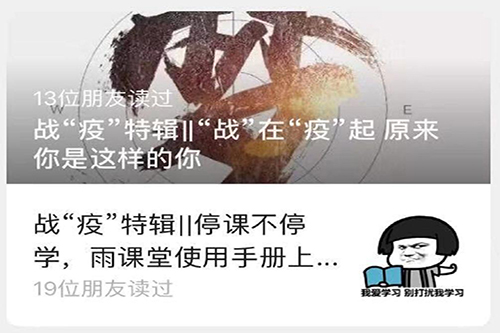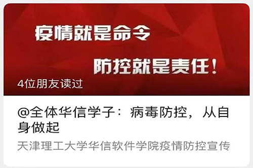 面對當前疫情防控特殊時期,學工隊伍積極探索網絡思政教育新思路新方法,堅持做好宣傳教育工作,引導學生理性關注疫情,不傳謠、不信謠,保持健康、穩定的身心狀態,堅定戰勝疫情的信心和決心。學工部微信公眾號“天理學工”每天發布師生原創推文,轉載官方權威信息,全力做好學生科學防疫知識普及、思政引導、心理疏導等工作。發布“同力協契共克時艱——致學校全體學生的一封信”“錘煉政治品格 踐行使命擔當——致學校全體學生黨員的倡議書”“致全體天理輔導員的一封信”,鼓勵廣大學生和輔導員隊伍堅定必勝信心,科學面對疫情,弘揚正能量;通過“少年易老學難成,一寸光陰不可輕”“這個假期,天理人的抗‘疫’行動”“武漢,我們春暖花開見”“開卷有益小編薦讀”“運動有益輔導員帶你一起居家健身”等輔導員原創微文、手繪作品、運動視頻等,引導學生養精蓄銳,合理規劃假期生活;發出“藝術戰‘疫’”主題作品集結號,引領天理學子心手相牽,合力戰“疫”!