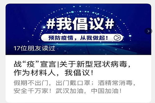 材料科學與工程學院師生發錄制視頻布戰“疫”宣言,從我做起倡議材料學子相應科學防疫號召,做好自我防護,保護家人安全,為武漢加油,為中國加油!