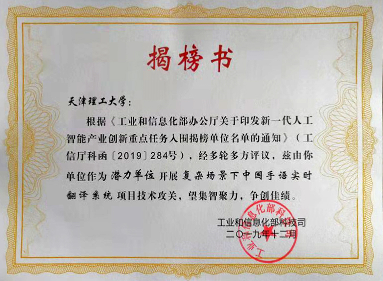日前,國家工業(yè)和信息化部新一代人工智能產業(yè)創(chuàng)新重點任務入圍單位揭曉(工信部科函[2019]284號),我校聾人工學院袁甜甜主持的《復雜場景下中國手語實時翻譯系統(tǒng)》項目成功獲批。