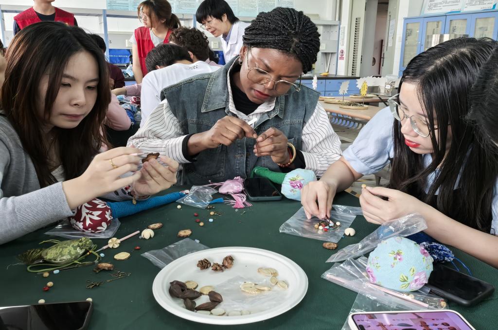 在沉浸式手工體驗(yàn)環(huán)節(jié),留學(xué)生們分組參與了養(yǎng)生錘制作、中藥香囊DIY和中藥耳飾創(chuàng)作等活動(dòng)。在老師和志愿者的指導(dǎo)下,他們根據(jù)藥材功效親手挑選藿香、白芷、黃芩等草本原料,精心制作專屬養(yǎng)生錘、香囊和耳飾,體驗(yàn)中醫(yī)藥的實(shí)用性與藝術(shù)性。留學(xué)生們紛紛展示養(yǎng)生錘、香囊、中藥耳飾等作品,驚嘆中醫(yī)藥與傳統(tǒng)手工藝的巧妙結(jié)合。