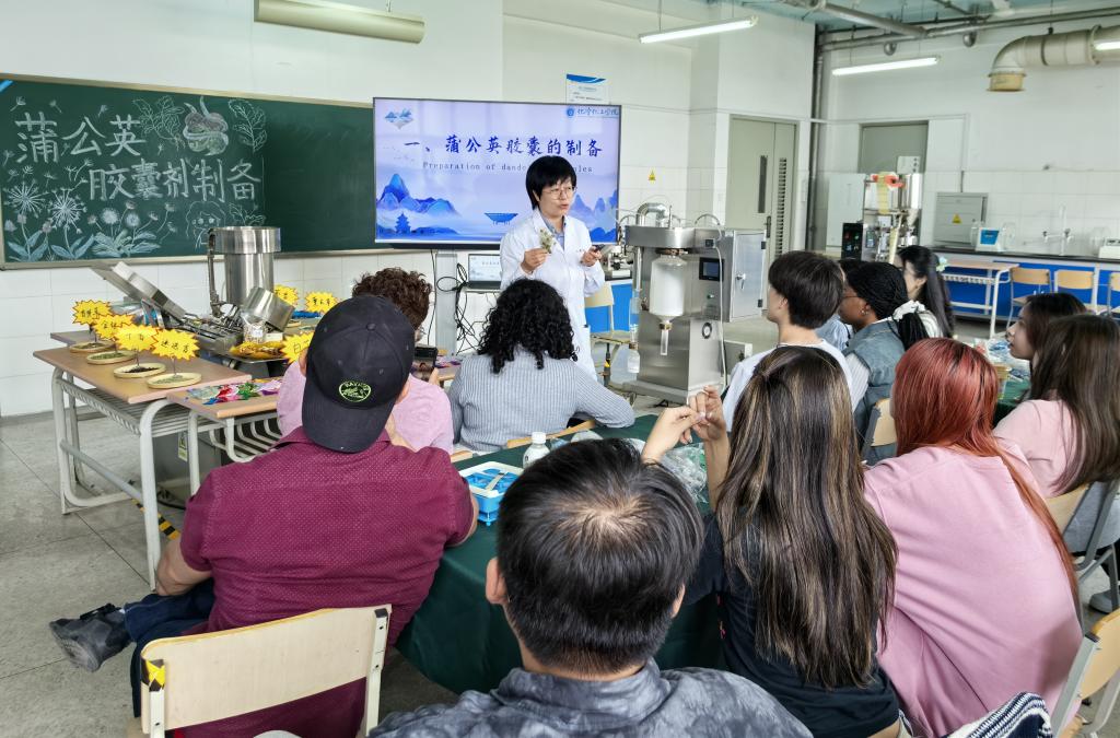在制藥工程系教學(xué)實(shí)驗(yàn)室內(nèi),專業(yè)課教師李彩文以常見的蒲公英、艾草、陳皮等中草藥為切入點(diǎn),詳細(xì)介紹了它們的性味、功效、炮制方法等,并生動(dòng)講解了藥物的提取、分離及制備的科普知識(shí)。留學(xué)生們親手體驗(yàn)蒲公英膠囊的制備,從稱量原料到填充封裝,直觀感受中醫(yī)藥與現(xiàn)代制藥技術(shù)的完美融合。