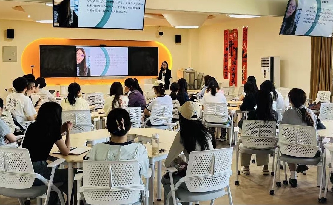 陳虹霖教授作題為《From justice to inclusion: E-health service for older adults》的現場講座,與學院師生分享老年人數字健康服務的芬蘭實踐。東芬蘭大學社會科學學院系主任Timo Toikko教授通過線上形式發表《Balancing Demand and Provision in Social Services: Insights from Finnish Data》主題演講,解析了芬蘭社會服務供需平衡經驗。講座現場反響熱烈,師生就技術倫理、服務本土化等議題開展深度交流。