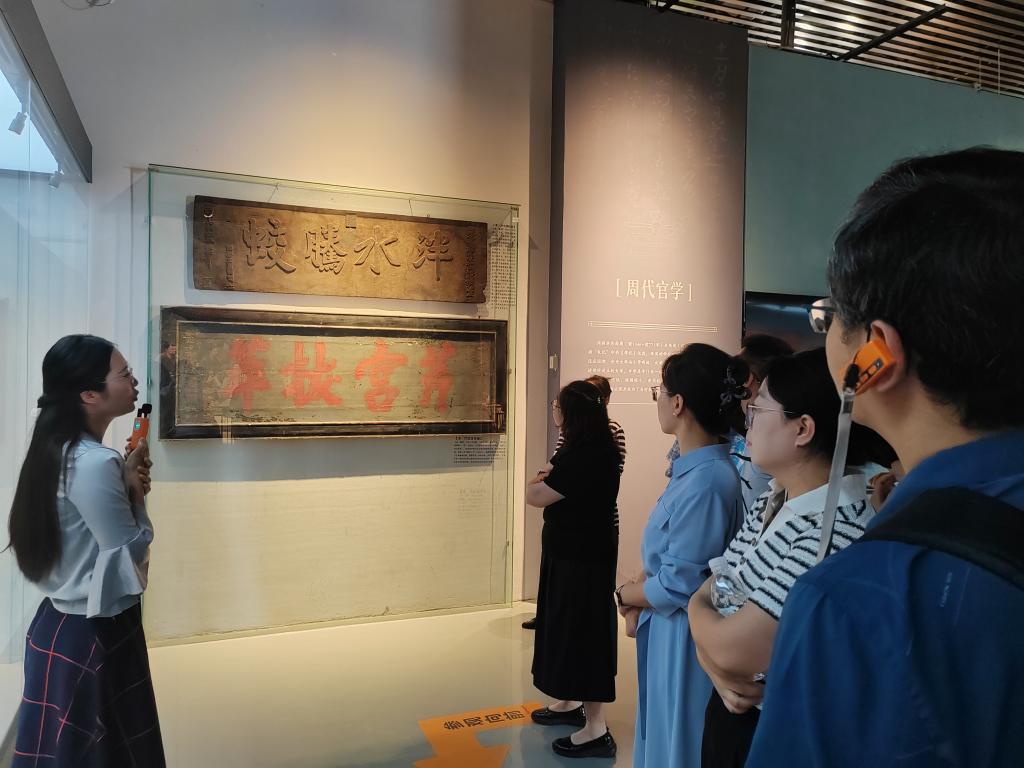 在中國教師博物館的現場教學中,黨員教師以“師道溯源”為脈絡,系統追溯教師職業起源與師德建設的歷史邏輯,將教育家精神與“時代楷?!鄙疃热诤稀T邳h校教師的引導下,眾人透過歷代教育典籍、教具展品與師德典故,于復原的孔子杏壇講學場景前,深刻感悟“有教無類”的教育理念,切實體會教師職業自誕生起便肩負的育人使命。在陶行知“捧著一顆心來,不帶半根草去”的實物手稿前,大家細品其“生活即教育”理念中蘊含的無私奉獻精神,對照“時代楷模”黃大年“心有大我、至誠報國”的先進事跡,感悟師德典范中紀律自覺與育人擔當的傳承。
