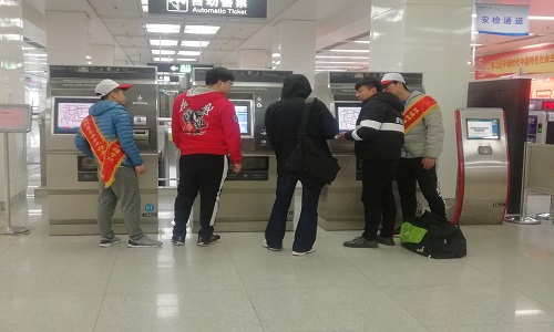 第三組志愿者服務隊在紅旗南路地鐵站開展了“平安出行”志愿服務活動。為了行人出行的方便和安全,環志愿者們在上下班人流高峰時段進行服務。指引乘客并維持乘客的通行秩序,保證人流高峰期地鐵站的通暢。