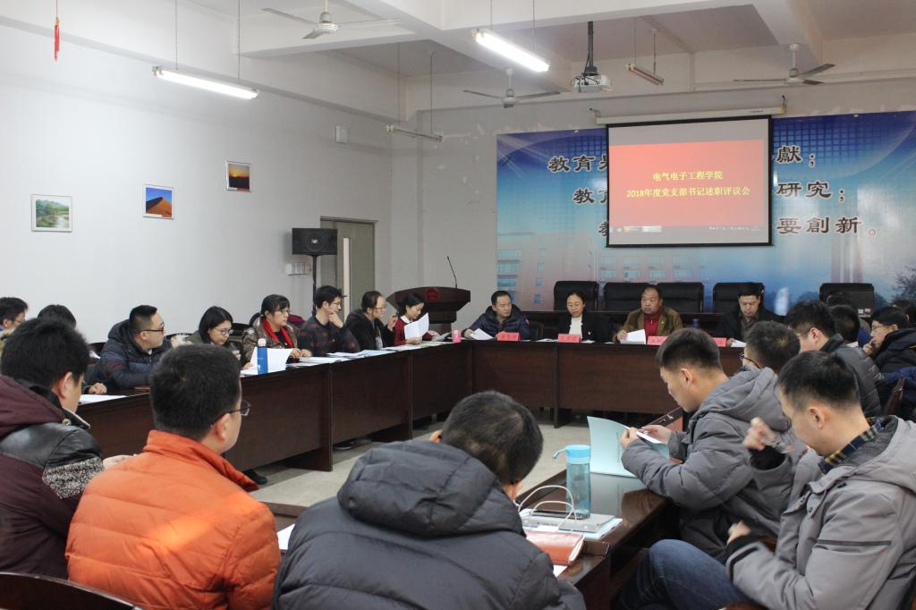 1月11日,電氣電子工程學院召開2018年度黨支部書記述職考核評議會,學院黨委委員、支部書記、系主任、校黨代會代表、民主黨派代表、無黨派人士及師生黨員群眾代表61人參加了會議。23個黨支部書記進行了述職并接受了現場評議。