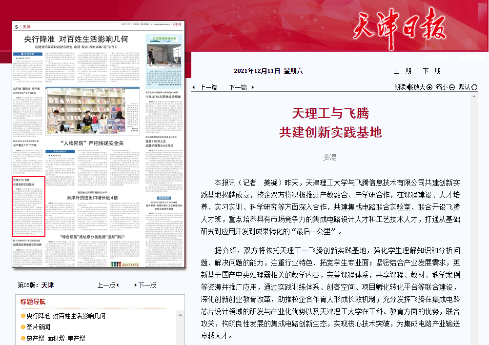天津理工大學與飛騰信息技術有限公司共建創新實踐基地揭牌成立,校企雙方將積極推進產教融合、產學研合作,在課程建設、人才培養、實習實訓、科學研究等方面深入合作,共建集成電路聯合實驗室、聯合開設飛騰人才班,重點培養具有市場競爭力的集成電路設計人才和工藝技術人才,打通從基礎研究到應用開發到成果轉化的“最后一公里”。