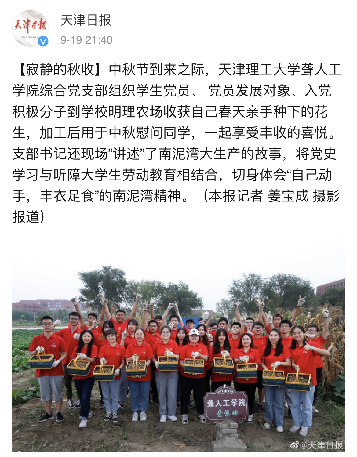 中秋節到來之際,天津理工大學聾人工學院綜合黨支部組織學生黨員、 黨員發展對象、入黨積極分子到學校明理農場收獲自己春天親手種下的花生,加工后用于中秋慰問同學,一起享受豐收的喜悅。支部書記還現場”講述”了南泥灣大生產的故事,將黨史學習與聽障大學生勞動教育相結合,切身體會“自己動手,豐衣足食”的南泥灣精神。