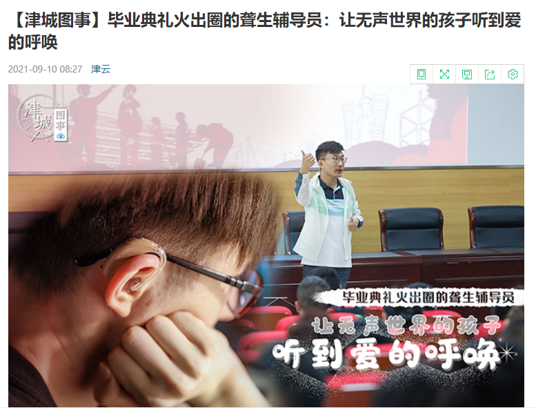 今年是王曉鷗工作的第10個年頭,“我學的是社會工作專業,就業方向主要是針對社會上有幫扶需求的人群進行相關的幫助和服務?!庇捎趯I對口且成績優異,畢業后王曉鷗順利留校任教,成為了天津理工大學聾人工學院的一名聾生輔導員。前段時間,在天津理工大學的畢業典禮上,王曉鷗為聽障生翻譯畢業實況火出了圈,網友紛紛說道:“這個老師超好,臺上一直講,他就一直在比手語,還給了他很多鏡頭,讓全校的畢業生能看見他,肯定了他的付出。”“感動,學??紤]全面,人人平等,老師一絲不茍的翻譯,學生認真看?!笔聦嵣?,不僅是畢業典禮,在學校大大小小的活動中聾人工學院的老師已堅持了30年,王曉鷗承擔這份工作也有七八年之久。