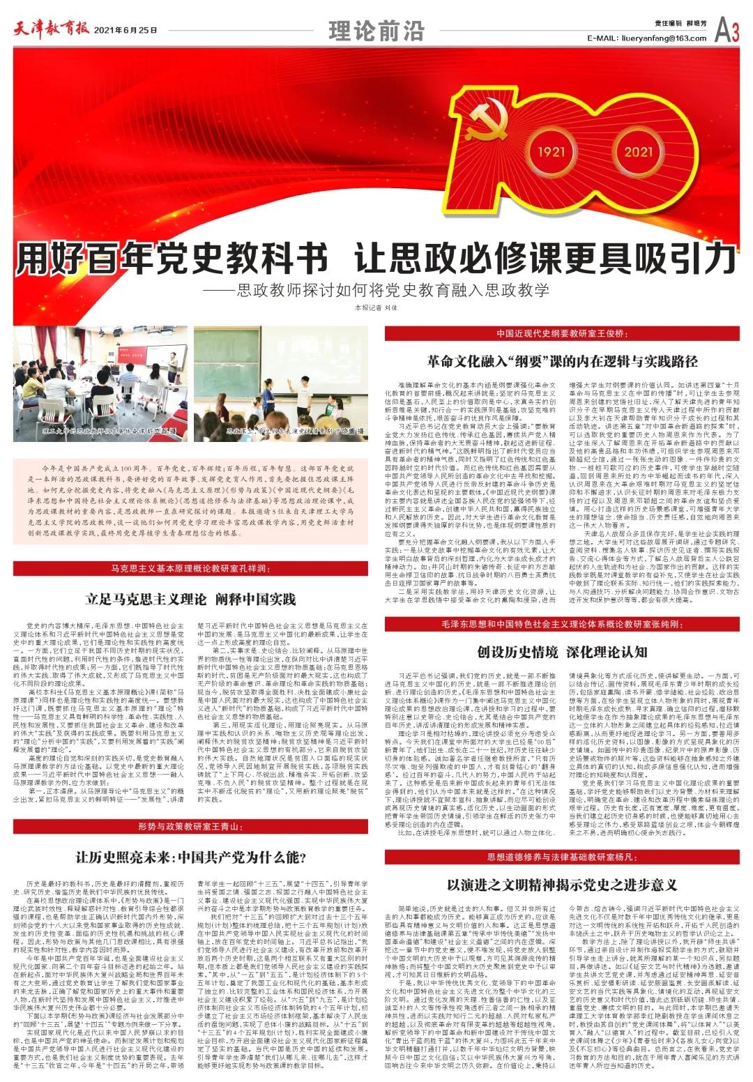 今年是中國共產黨成立100周年。百年黨史,百年輝煌;百年歷程,百年智慧。這部百年黨史就是一本鮮活的思政課教科書,要講好黨的百年故事、發揮黨史育人作用,首先要把握住思政課主陣地。如何充分挖掘黨史內容,將黨史融入《馬克思主義原理》《形勢與政策》《中國近現代史綱要》《毛澤東思想和中國特色社會主義理論體系概論》《思想道德修養與法律基礎》等思想政治理論課中,成為思政課教材的重要內容,是思政教師一直在研究探討的課題。本報邀請5位來自天津理工大學馬克思主義學院的思政教師,談一談他們如何用黨史學習理論豐富思政課教學內容,用黨史鮮活素材創新思政課教學實踐,最終用黨史厚植學生青春理想信念的根基。