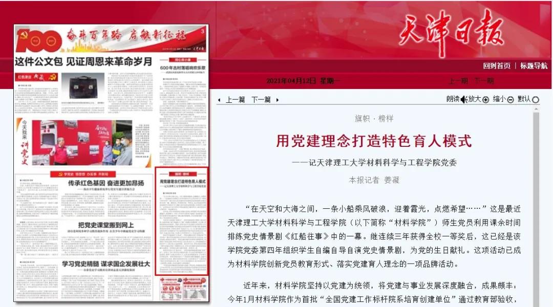 日前,《天津日報》對我校材料科學與工程學院黨委用黨建理念打造特色育人模式的情況進行了報道,詳細報道如下: