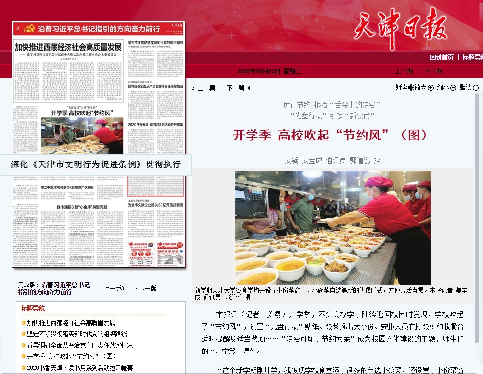 近日,天津日報對我校開展的“光盤行動”進行了報道,全文如下: