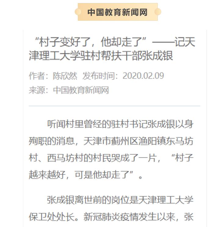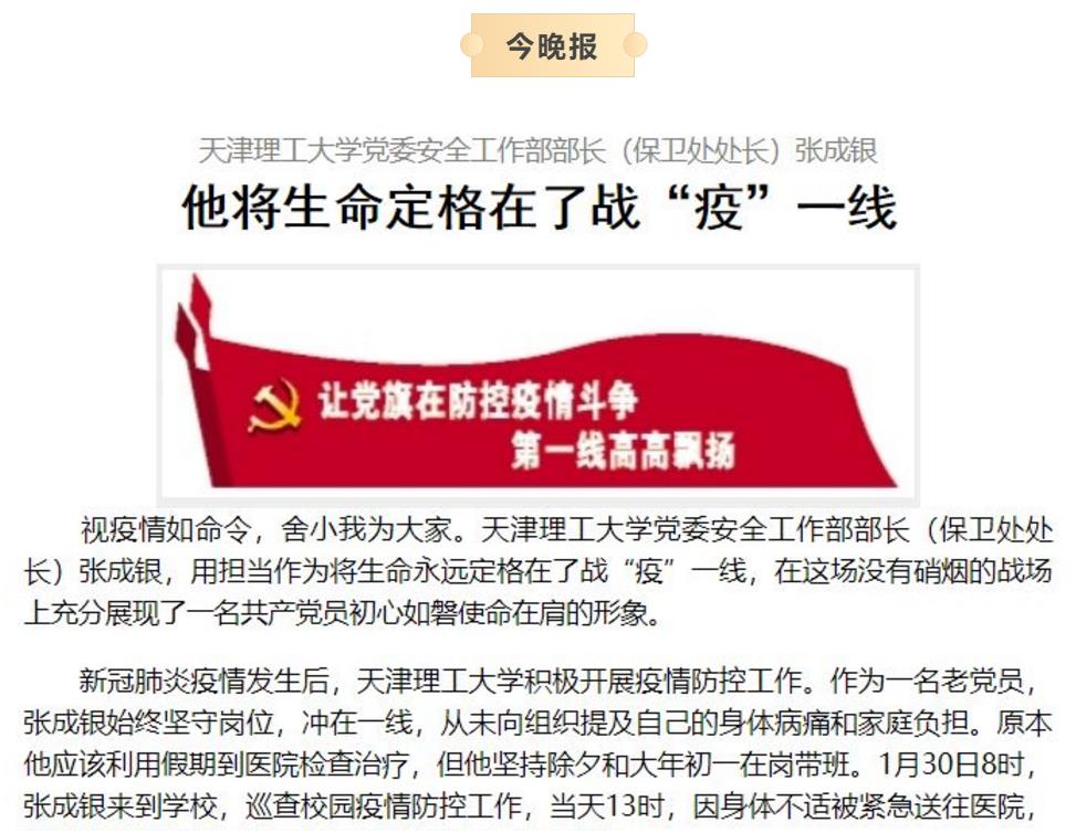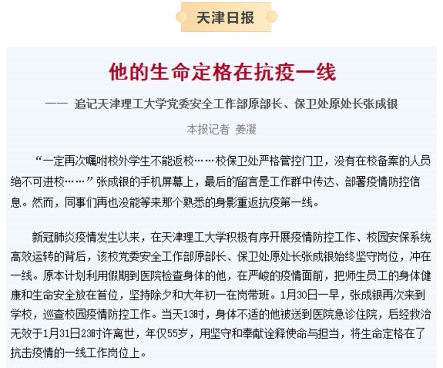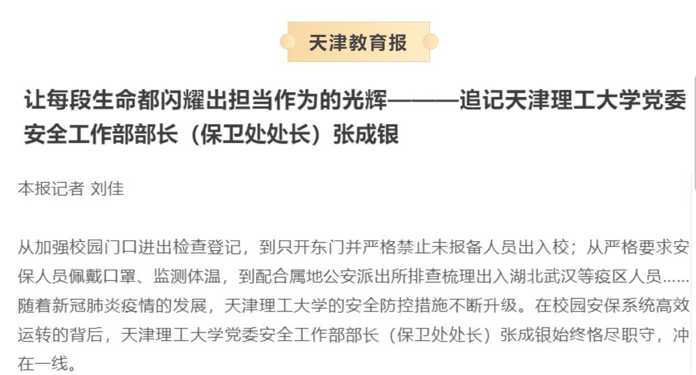 張成銀,男,漢族,河北省人,1964年11月出生,1988年7月參加工作,1999年6月加入中國共產黨,天津理工大學黨委安全工作部原部長、保衛處原處長。2020年1月30日在校園巡查疫情防控工作時,突發上消化道出血,經醫治無效于1月31日不幸去世,年僅55歲。張成銀同志對黨忠誠、愛崗敬業、心系師生,面對嚴峻復雜的疫情防控形勢,他迅速制定工作方案,對校園實行封閉式管理,從除夕開始就堅持在崗帶班,與校園安保人員一起日夜巡視校園,加強校園進出檢查登記和監測體溫,配合屬地公安派出所排查梳理出入疫情重點地區人員,不放過任何一個隱患,確保校園各項防控措施落實到位。