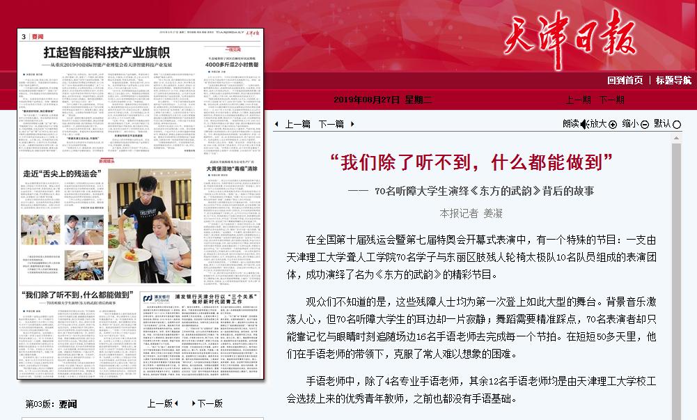 在全國第十屆殘運會暨第七屆特奧會開幕式表演中,有一個特殊的節目:一支由天津理工大學聾人工學院70名學子與東麗區肢殘人輪椅太極隊10名隊員組成的表演團體,成功演繹了名為《東方的武韻》的精彩節目。 觀眾們不知道的是,這些殘障人士均為第一次登上如此大型的舞臺。背景音樂激蕩人心,但70名聽障大學生的耳邊卻一片寂靜;舞蹈需要精準踩點,70名表演者卻只能靠記憶與眼睛時刻追隨場邊16名手語老師去完成每一個節拍。在短短50多天里,他們在手語老師的帶領下,克服了常人難以想象的困難。