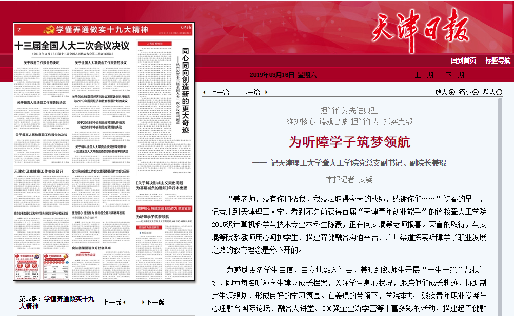 “姜老師,沒有你們幫我,我沒法取得今天的成績,感謝你們……”初春的早上,記者來到天津理工大學(xué),看到不久前獲得首屆“天津青年創(chuàng)業(yè)能手”的該校聾人工學(xué)院2015級(jí)計(jì)算機(jī)科學(xué)與技術(shù)專業(yè)本科生陳豪,正在向姜琨等老師報(bào)喜。榮譽(yù)的取得,與姜琨等院系教師用心呵護(hù)學(xué)生、搭建聾健融合溝通平臺(tái)、廣開渠道探索聽障學(xué)子職業(yè)發(fā)展之路的教育理念是分不開的。